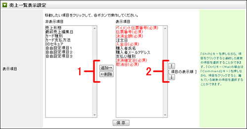 複数の項目をまとめて移動させることも可能です。 「Shift」キーを押しながら、項目をクリックすると連続した複数の項目を選択、または「Ctrl」キー(Macの場合は「Command」キー)を押しながら、項目をクリックすると、離れている複数の項目を選択することができます。※有料オプションの定期購入・継続課金機能を契約している場合は「定期購入番号」「定期購入回数」「定期購入周期」が追加されます。